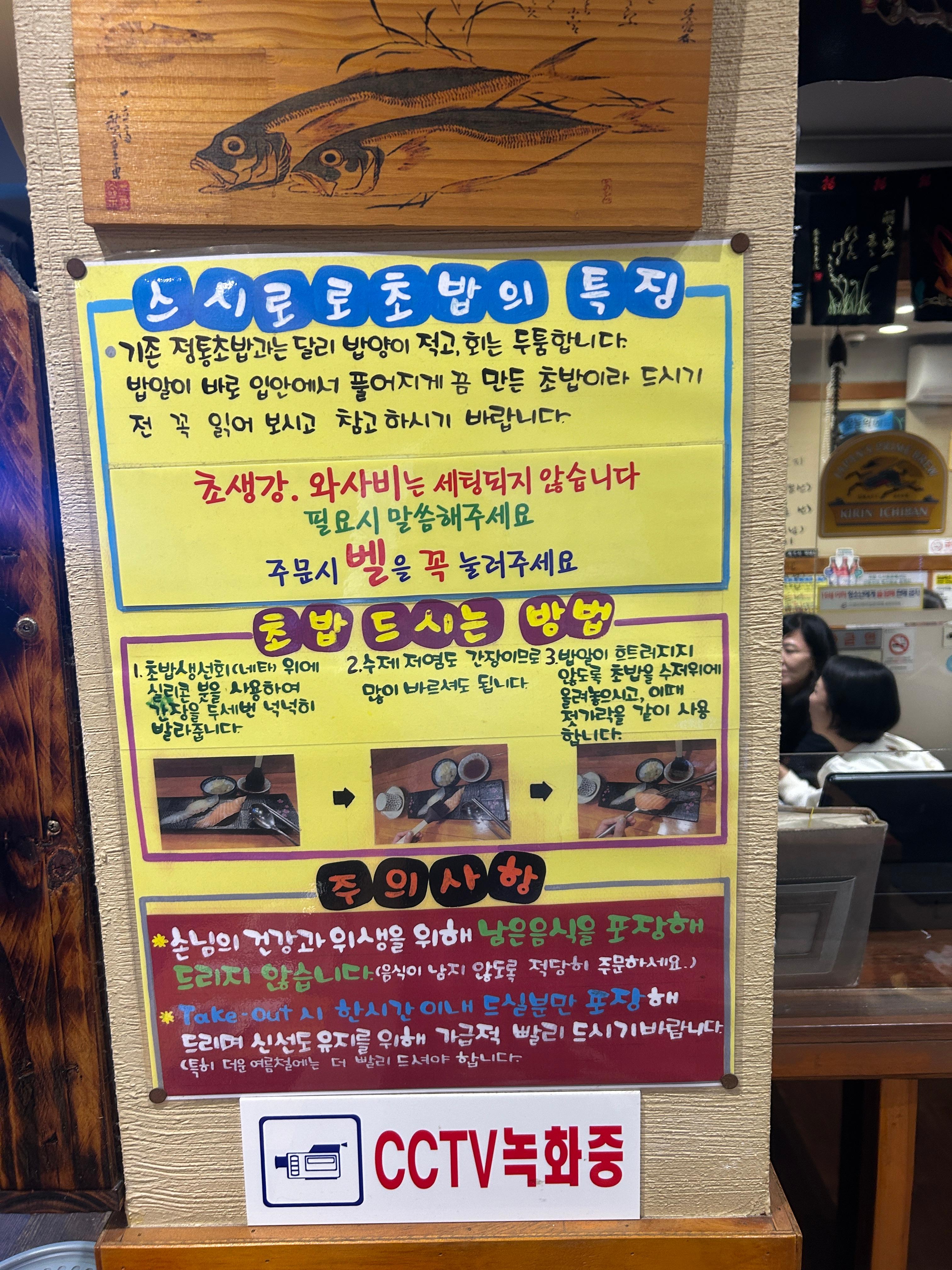 가게 벽면 곳곳에 붙은 안내문을 보면, 스시로로의 철학이 드러나요.
