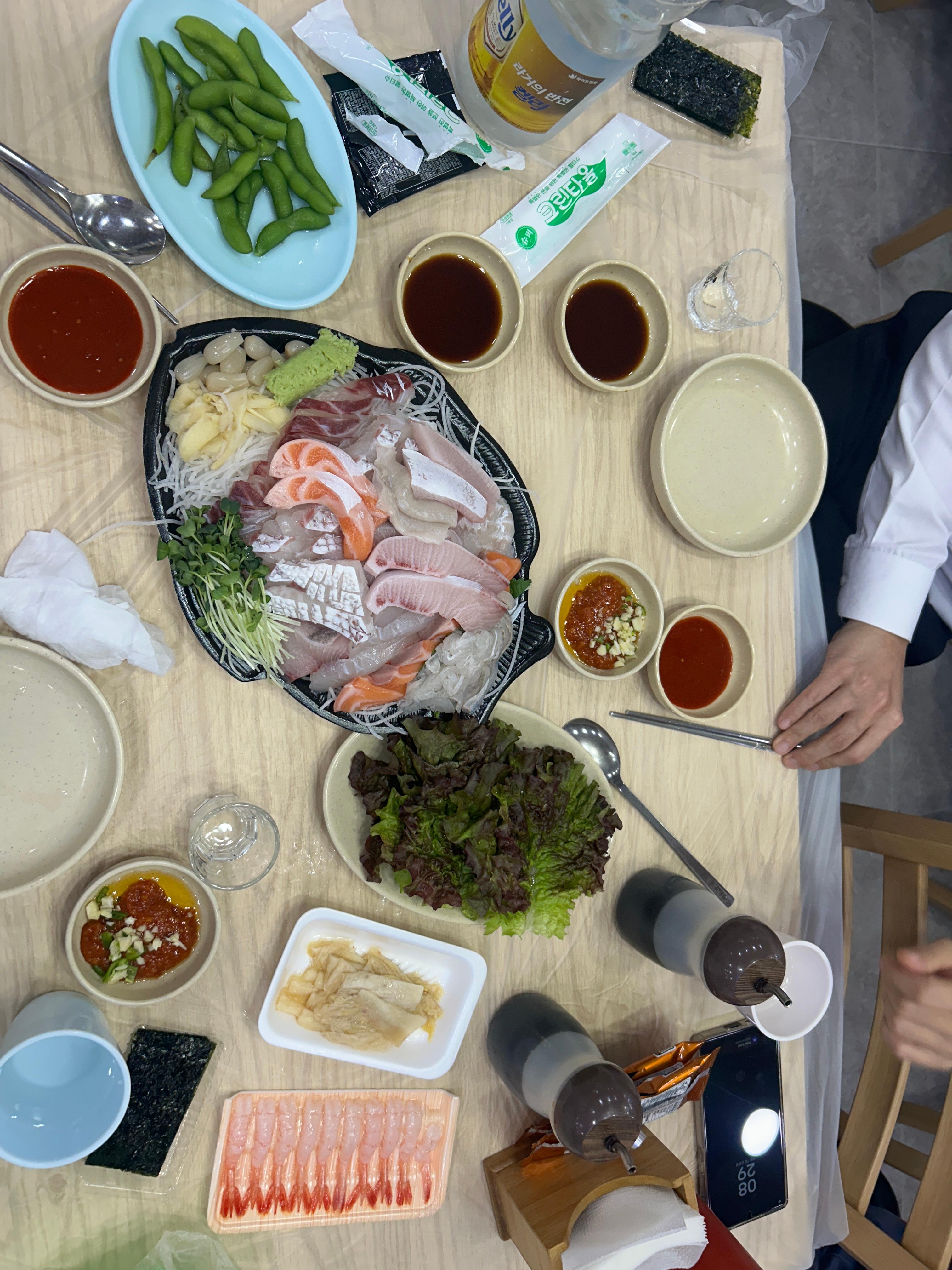 예전에 자주 갔던 **‘푸른바다’**에서 회를 포장하고, 늘 가던 **‘황금어장 초장집’**으로 향했다.
