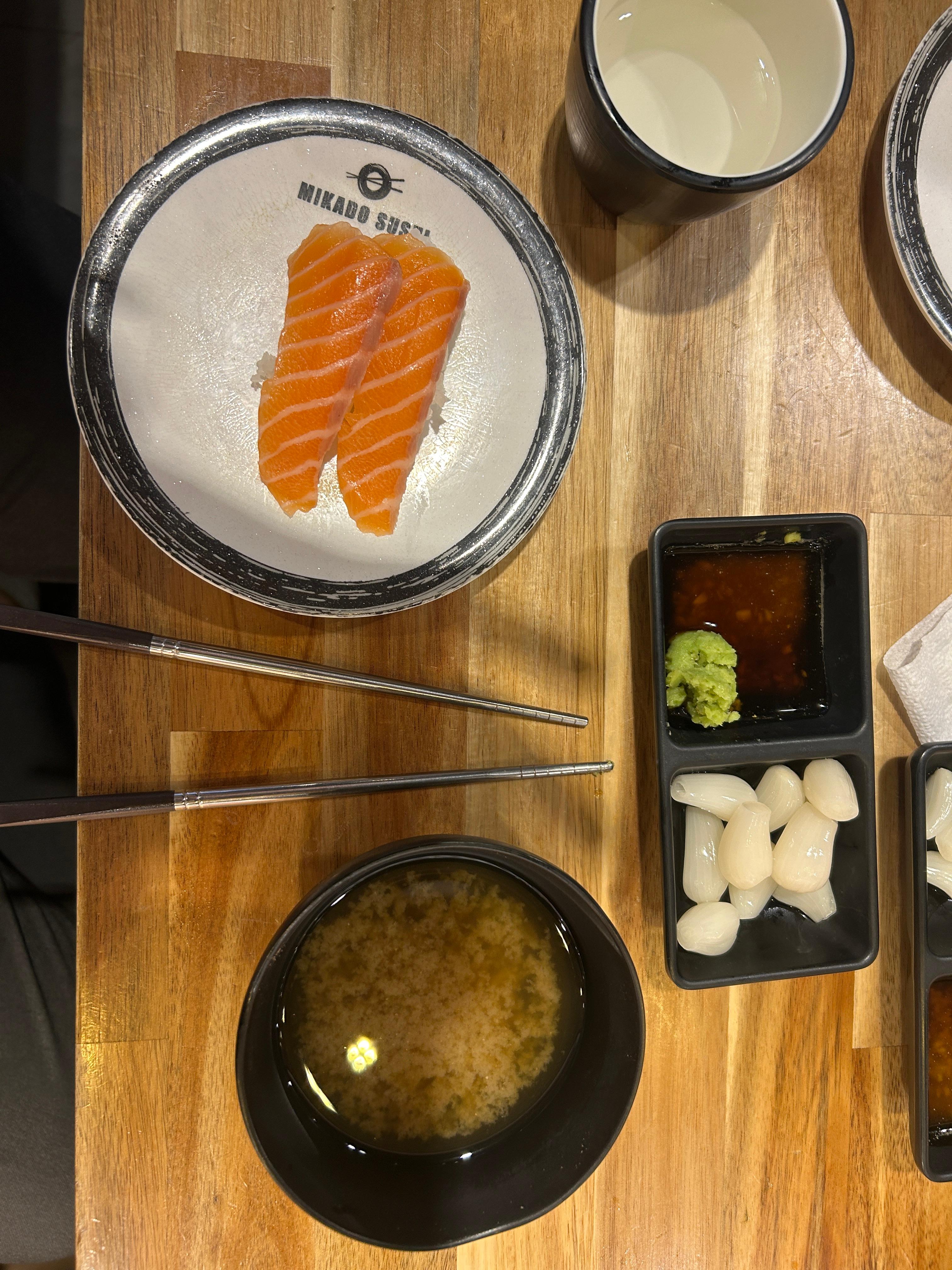 인테리어는 우드 톤과 조명 덕분에 모던하고 깔끔한 느낌이 들었고, 회전 트랙이 매장을 한 바퀴 둘러싸고 있어 자리에 앉자마자 초밥을 바로 고를 수 있는 구조예요.